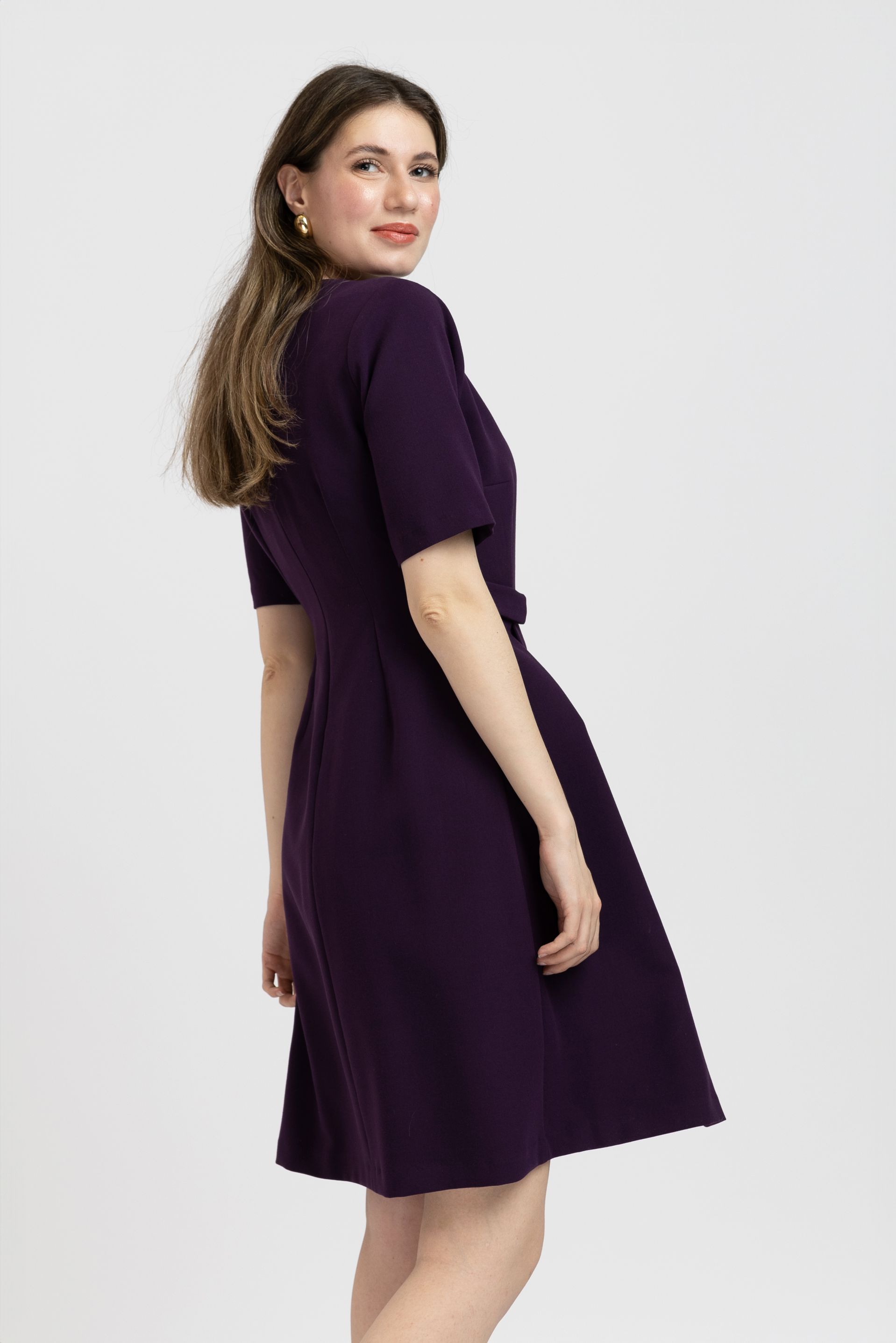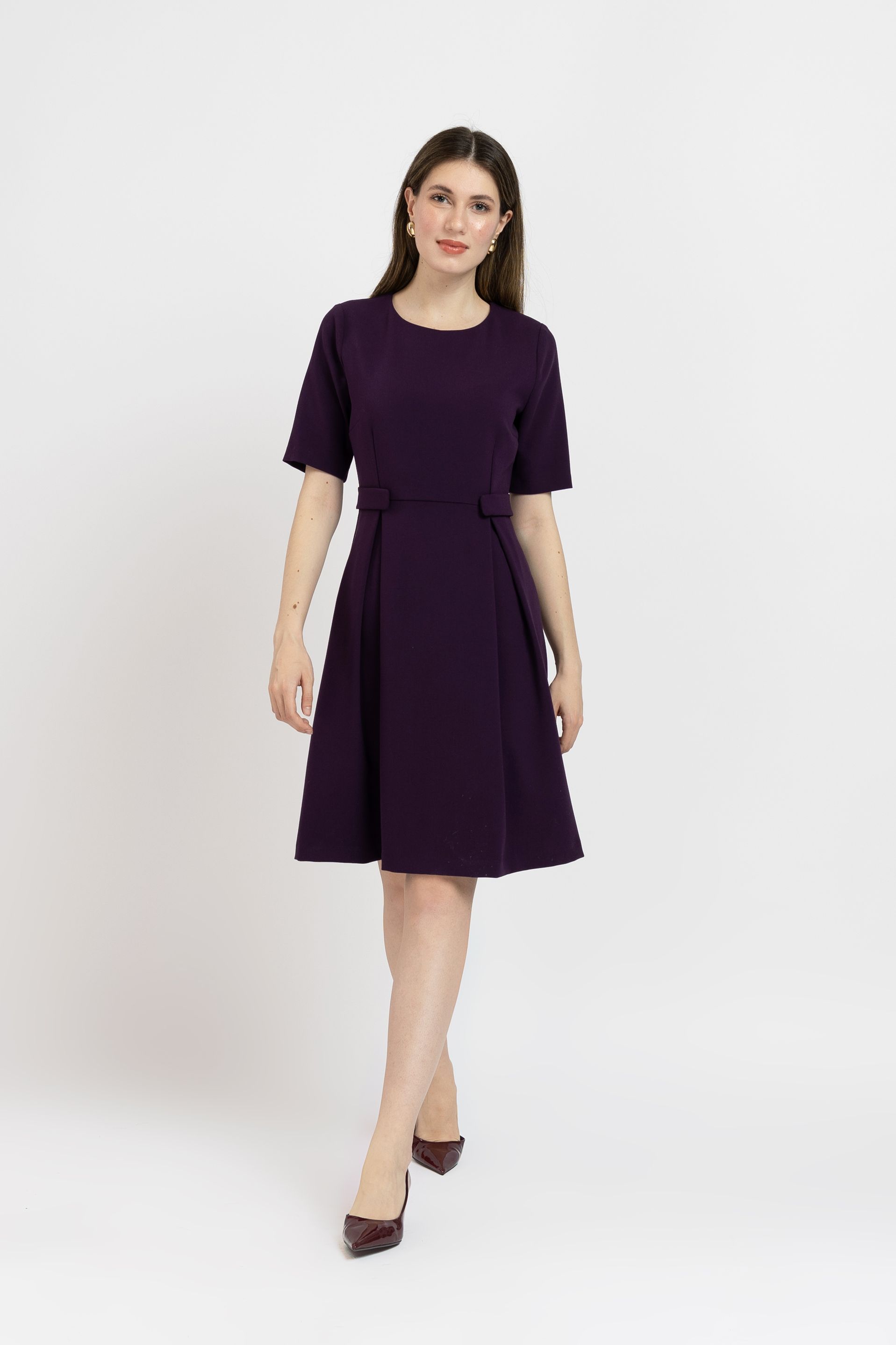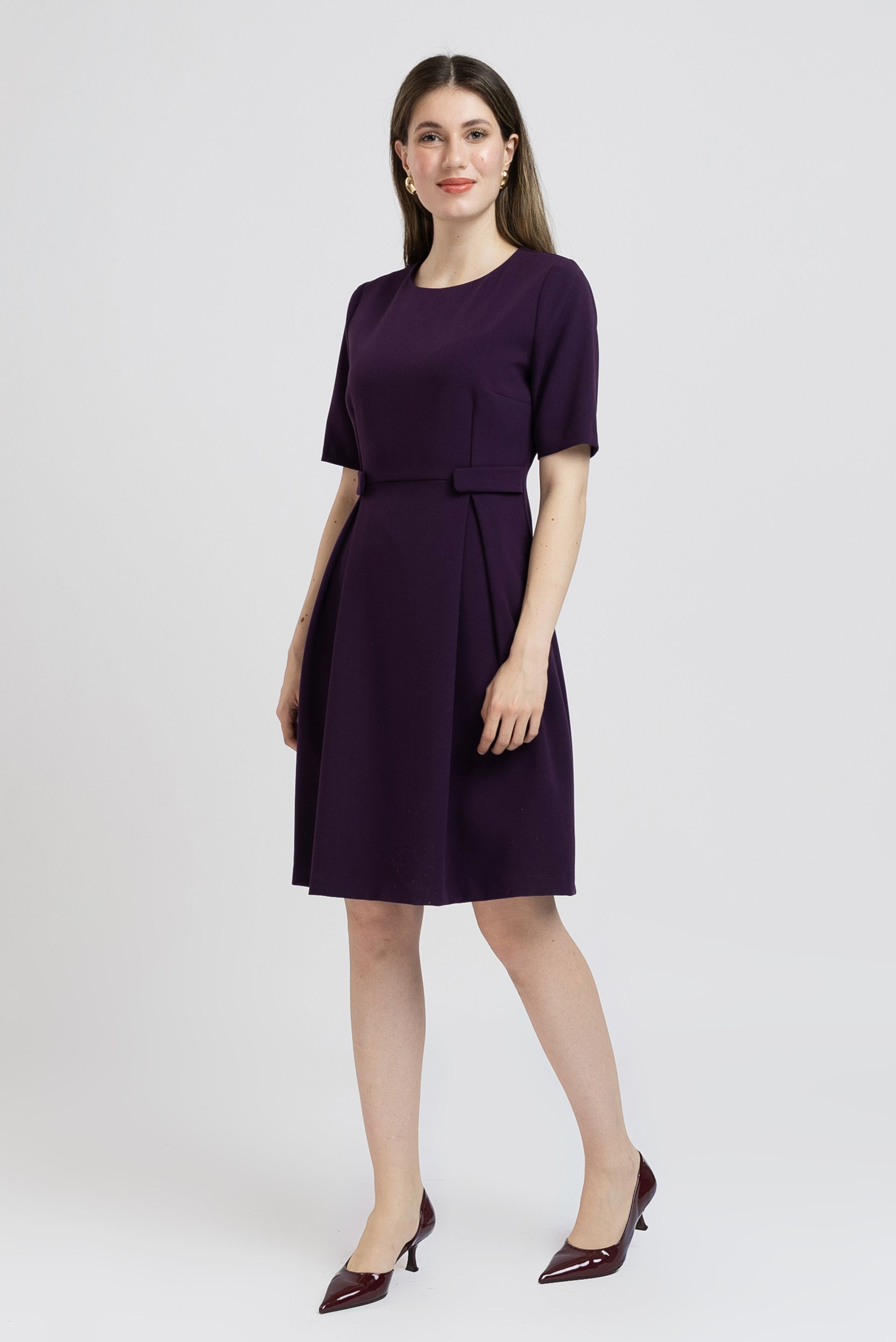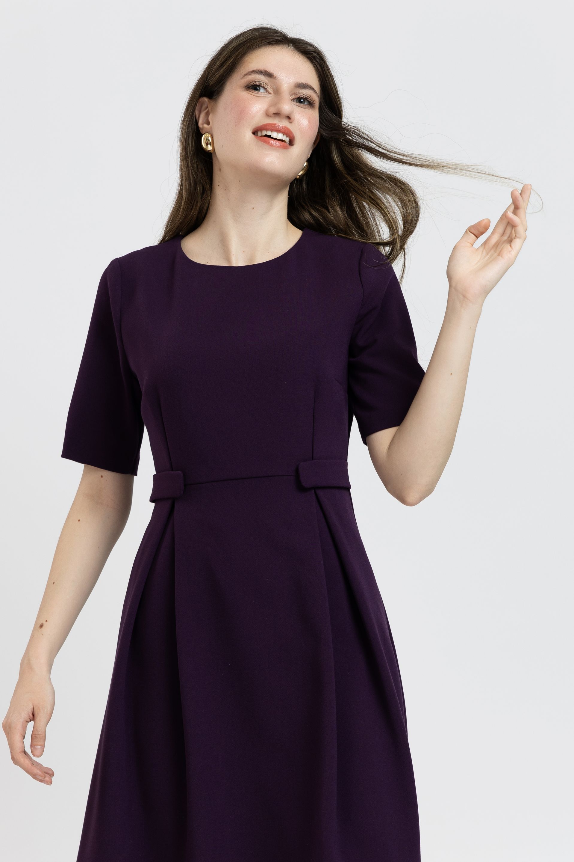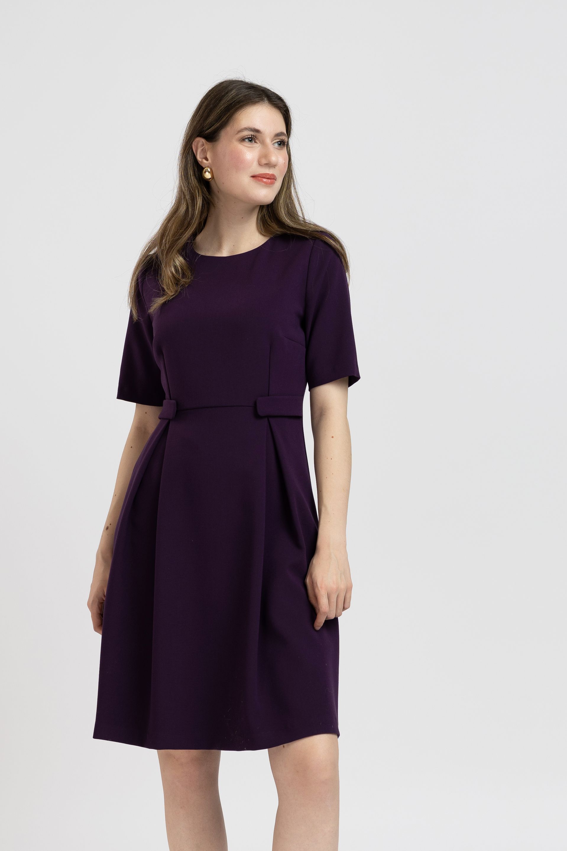 Klänning i tyg med två främre veck och dekorativa band. Diskreta veck och dold dragkedja bak. Fodrad med acetatfoder.